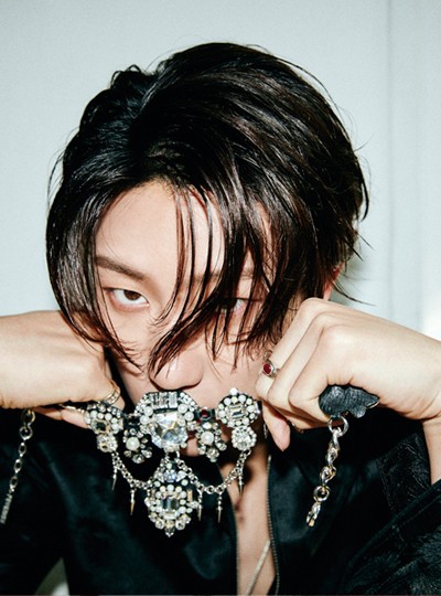 검은색 재킷 생 로랑 by 안토니 바카렐로, 허리에 묶은 카디건 셀린느 옴므 by 에디 슬리먼, 벨벳 팬츠 벨페, 슈즈 프라다, 네크리스·링 모두 오르또, 무릎의 네크리스 피버리쉬 제품.
