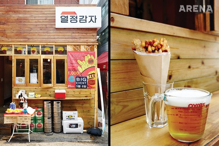 낮술 충동은 때때로 시각적 자극에서 비롯된다. 감자튀김이란 안개꽃과도 같아서, 다른 안주와 함께일 때는 있는 듯 없는 듯하지만 없을 때는 그 부재가 실로 크다. 또한 홀로 마실 때 더욱 매력적인 안주다. 감자튀김과 크림 생맥주는 지나가는 애주가들의 낮술 본능을 부추기는 열정감자의 핵심 무기다. 레귤러 컷과 웨지 컷, 두 종류의 감자튀김은 주문 즉시 튀겨내 언제든 뜨끈뜨끈하고 포슬포슬한 맛이 일품이다. 5백원을 추가하면 적당히 짭조름한 양념 감자로 변신한다. 단일 메뉴지만 치즈갈릭, 와사비 마요, 바비큐 등 10여 가지가 넘는 소스를 구비해 다양하게 조합해 먹어보는 재미가 있다. 양념 감자에 치즈갈릭 소스, 그리고 일반 감자에 발사믹 흑임자 소스 조합 모두 크림 생맥주의 부드러운 맛과 목 넘김에 아주 잘 어울린다. 참고로 지척에 여중, 여고, 여대가 있어서 열정감자는 낮부터 밤까지 늘 꽃 같은 여학생들로 붐빈다. 참고만 하자.