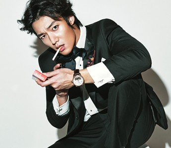 ◀검은색 더블브레스트 턱시도 수트 권오수 클래식, 흰색 핀턱 셔츠·커프링크스 모두 알프레드 던힐, 클래식한 갈색 스트랩 시계 잉거솔 by 유로파인, 라이터는 S.T. 듀퐁, 재킷의 브로치 마르스봄 제품.