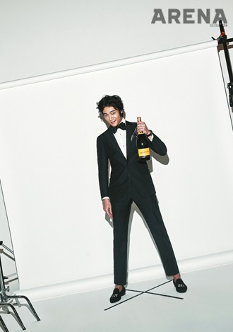 ◀ 검은색 턱시도 수트·보타이·핀턱 셔츠·커프링크스 모두 알프레드 던힐, 검은색 슬립온 아니마스코드, 검은색 스트랩 시계 브루노 쇤르 by 유로파인, 최진혁이 들고 있는 샴페인은 샴페인 드라피에 제품.