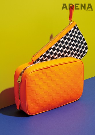 여름에 필요한 건 물에 강하고, 색감이 시원한 파우치다. 물이 묻어도 얼룩이 생기지 않는 형광 주황색 파우치 가격미정 루이 비통, 기하학적인 패턴이 돋보이는 납작한 파우치 26만원 피에르 하디 by 무이 제품.