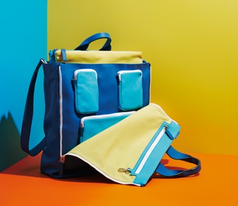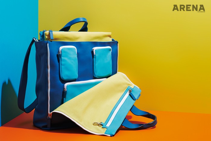 옆면의 지퍼를 열면 작은 주머니 장식들이 드러난다. 내부에 노란색과 하늘색 파우치가 있는데 일부러 높게 디자인했다. 경쾌한 색감을 뽐내기 위해서다. 들거나 멜 수 있다. 가격미정 살바토레 페라가모 제품.