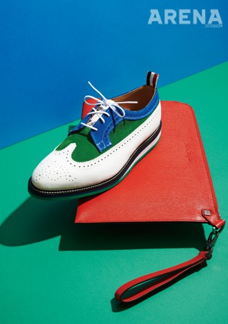 윙팁 슈즈에 흰색과 녹색, 파란색을 매치하고 가벼운