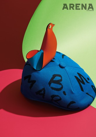 마크 제이콥스의 이니셜을 낙서처럼 그려 넣은 파란색 헌팅캡 12만8천원 캉골×마크 by 마크 제이콥스, 짙은 하늘색과 주황색 가죽이 어우러진 새 장식품 가격미정 에르메스 제품.