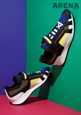 형광 노란색과 군청색을 포인트로 조합해 보색 대비 효과를 노렸다. 굵은 검은색 테두리 장식과 흰색 끈 덕분에 기하학적인 분위기가 물씬 난다. 85만원 피에르 하디 by 10 꼬르소 꼬모 제품.