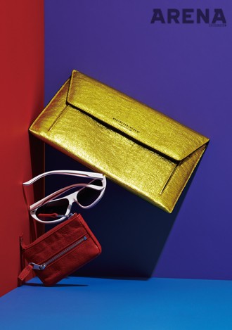 클러치로 활용할 수 있는 금색 아이패드 케이스 95만원 버버리 프로섬, 흰색에 빨간색 줄 장식이 있는 플라스틱 선글라스 39만원 구찌 아이웨어 by 사필로, 빨간색 동전지갑 36만5천원 발렌시아가 by 무이 제품.