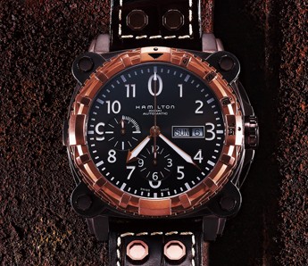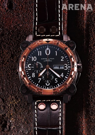 PVD 코팅한 건메탈 컬러의 케이스와 투박한 구릿빛 회전 베젤, 명쾌한 인덱스, 케이스 모서리의 스크루, 그리고 두툼한 스트랩과