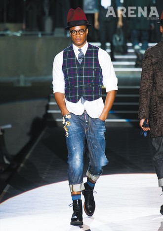 디스퀘어드2는 짧아 보이는 데님의 밑단을 또 한 번 척 접어 종아리까지 올렸는데, 다소 유치해질 수 있는 스타일링을 가볍지 않은 프레피 룩으로 마무리 지었다.