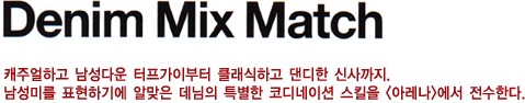 캐주얼하고 남성다운 터프가이부터 클래식하고 댄디한 신사까지. 남성미를 표현하기에 알맞은 데님의 특별한 코디네이션 스킬을 <아레나>에서 전수한다. [2006년 7월호] PHOTOGRAPHY 정재환 MODEL 이반(Ivan) hair&make up 김환 EDITOR 박만현