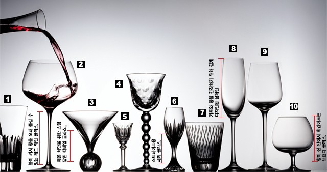 샴페인 글라스 서유럽에는 유방을 본뜬 잔에 귀한 손님을 대접하는 풍습이 있다. 마크 안토니를 대접할 때 클레오파트라와 마리 앙트와네트의 유방형을 본뜬 유리잔이 쓰였는데 거품과 향기가 빨리 없어지고 손 온도에 의해 술이 데워지는 흠이 있었다. 최고의 가슴을 쥐는 영광을 뿌리치고 만들어진 샴페인 잔은 유독 길다. 기포와 향을 잘 간직하기 위해 튤립이나 달걀 모양의 좁고 긴 글라스로 만들어졌다. 비벌리힐스 시리즈 플루트 샴페인 글라스 1만6천원 스피겔라우 제품.