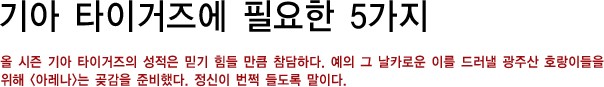 올 시즌 기아 타이거즈의 성적은 믿기 힘들 만큼 참담하다. 예의 그 날카로운 이를 드러낼 광주산 호랑이들을 위해 <아레나>는 곶감을 준비했다. 정신이 번쩍 들도록 말이다.<br><br>[2007년 8월호]