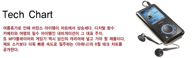여름휴가로 인해 바캉스 아이템이 차트에서 상승세다. 디지털 방수 카메라와 여행의 필수 아이템인 내비게이션이 그 대표 주자. 또 MP3플레이어와 게임기 역시 당신의 캐리어에 넣고 가야 할 제품이다. 제트 스키보다 더욱 빠른 속도로 질주하는 <아레나>의 8월 테크 차트를 공개한다.<br><br>[2007년 8월호]
