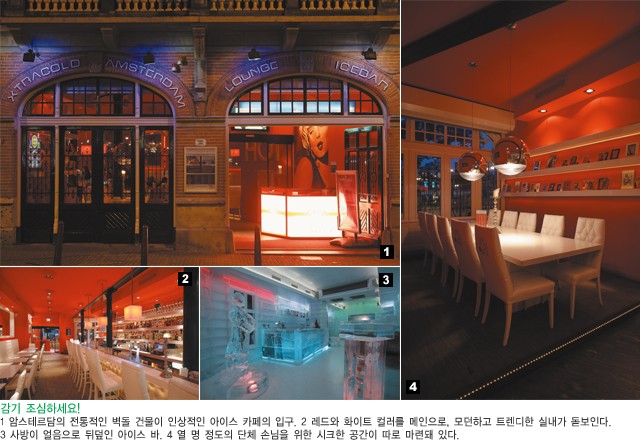 전 세계적으로 아이스 카페가 대세다. 스톡홀름, 밀라노, 런던, 도쿄, 코펜하겐, 상하이에 앱솔루트 아이스 바가 위세를 떨치자 이에 뒤질세라 하이네켄도 합세했다. 암스테르담의 가장 중심부에 자리한 이곳은 겉으로만 봐서는 도통 얼음하고는 어울리지 않게 생겨먹었다. 온통 빨간색으로 도배한 실내, 감각적인 벽면의 그림들, 커다란 샹들리에 등이 만들어낸 꼴을 보면 오히려 암스테르담 가이드북의 ‘핫 플레이스’ 섹션에 나올 만하다. 관광객으로 보이지 않는 젊은 객들도 테이블을 마주 보고 서로 카메라를 들이대며 사진 찍기에 바쁘다. 아름답고 다부진 근육의 멋쟁이 바텐더도 이곳을 감각적인 공간으로 만들어주는 데 한몫하는 듯. W호텔의 ‘우 바’에서나 볼 법한 기다란 바 테이블에서 화려한 손동작으로 칵테일을 만드는 이들의 모습이야말로 아가씨는 물론 게이에게도 눈돌아갈 일이다.
