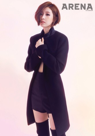 ◀ 검은색 코트는 타임, 하이 웨이스트 디자인의 반바지는 곽현주 컬렉션, 스웨이드 소재의 롱부츠는 스튜어트 와이츠먼 제품.