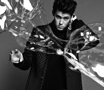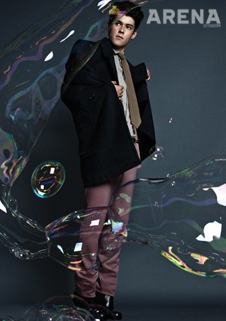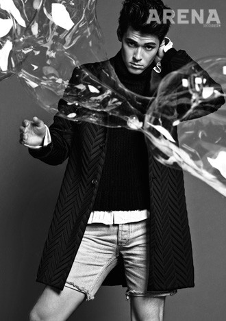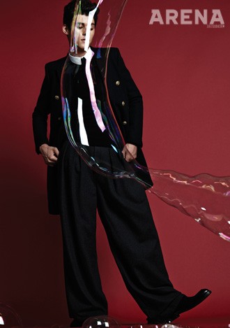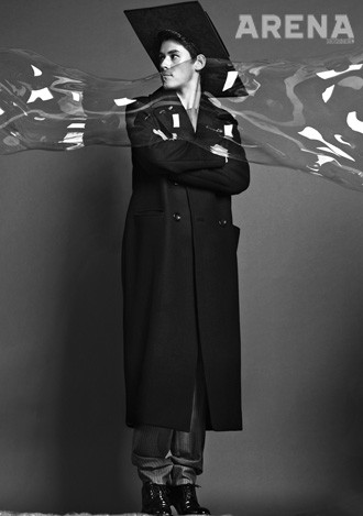 밀리터리 모티브의 더블브레스트 코트 가격미정 생 로랑, 라운드 칼라 셔츠 가격미정 돌체&가바나, 터틀넥 니트 JW 앤더슨 포 베르수스 베르사체, 진회색 울 팬츠 가격미정 준 지, 검은색 구두 가격미정 프라다 제품.