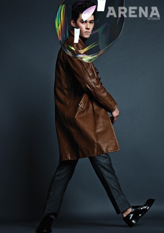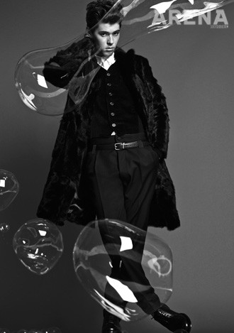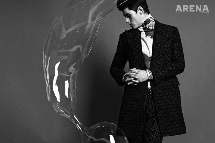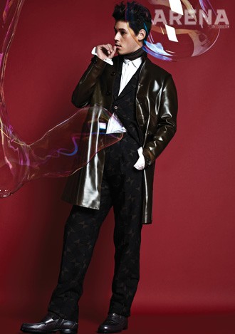 검은색 롱 코트·회색 줄무늬 수트·베스트 형태의 톱 모두 가격미정 장광효 카루소, 검은색 구두 71만원 일레븐티, 옷핀 형태의 브로치 가격미정 JW 앤더슨 포 베르수스 베르사체, 커다란 사각형 페도라 가격미정 톰 브라운 제품.