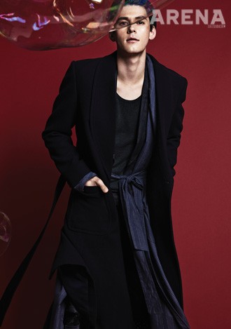 감색 숄칼라 코트 1백78만원 김서룡 옴므, 로브 에디터 소장품, 줄무늬 재킷·회색 니트 톱 모두 가격미정 루이 비통, 가죽과 여러 가지 원단이 패치워크된 데님 팬츠 가격미정 로에베×준야 와타나베, 감색 비니 가격미정 맥큐 제품.