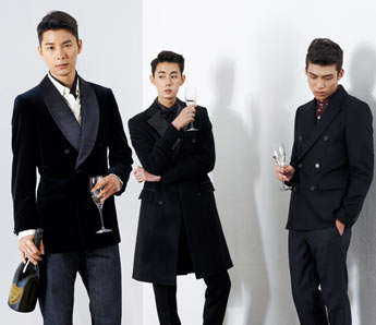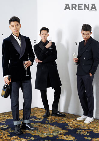 - 라펠에 가죽 소재를 덧댄 코트 가격미정 라피규라, 보타이 가격미정 디올 옴므, 가죽 소재 셔츠 가격미정 생 로랑, 팬츠 가격미정 버버리, 첼시 부츠 가격미정 준 지 제품.