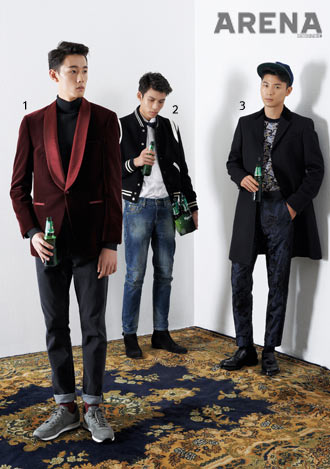 - 물방울 무늬의 버건디색 셔츠 10만8천원 리바이스, 흰색 캔버스 스니커즈 8만9천원 케즈, 짙은 남색의 더블브레스트 재킷 29만8천원 플랙진, 짙은 남색 팬츠 65만원 겐조 옴므 제품.