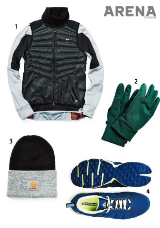 마지막으로 보온성이 뛰어난 러닝화를 구비한다. 특히 밑창을 눈여겨본다. 눈밭에서 슬라이딩하고 싶지 않다면 말이다. 트레킹화처럼 알차게 파인 모양이되 생고무만큼 무겁지 않은 걸로 고르면 된다. 손에 꼭 맞는 플리스 장갑과 니트 비니를 착용하는 것도 잊지 말 것.