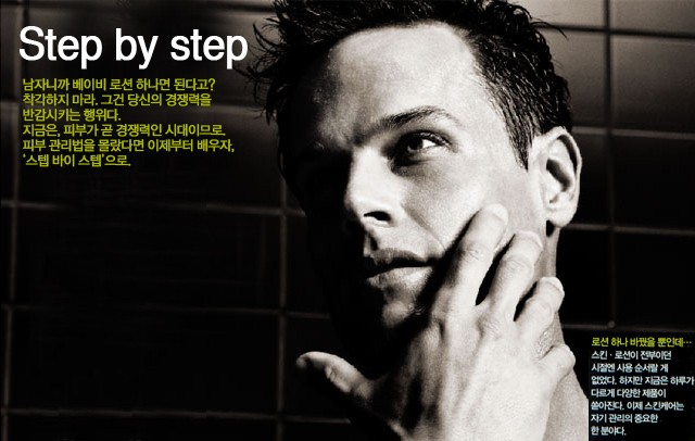 Step1기초는 꼼꼼한 세안 여성보다 피지 분비가 많은 남자는 꼼꼼한 세안만으로도 큰 효과를 볼 수 있다. 일반 비누보다는 피부 노폐물을 효과적으로 제거해주는 폼 클렌저를 사용하라. 클렌저도 이제는 피부 타입별로 출시되므로 제대로 골라 써야 한다. 1 지성 또는 모공이 큰 피부에 적당한 식물성 젤 타입 클렌저. 피부 밸런스를 유지해주고 세안으로 인한 수분 손실을 최소화한다. 어메이징 페이스 클렌저 200ml 5만7천원 에이솝 제품.