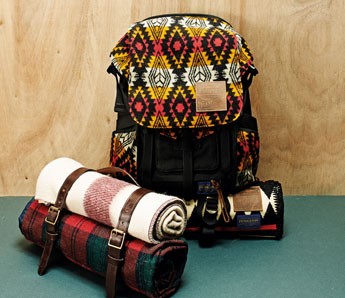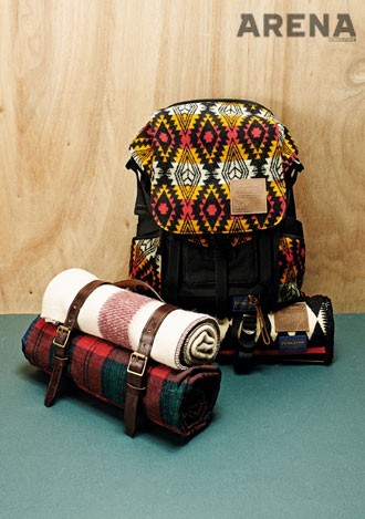 >> 체크 패턴의 담요·가죽 스트랩 모두 가격미정 존 채프먼 by 오쿠스, 베이지색 군용 담요 8만6천원 YMCL K by 아이엠샵, 담요와 백팩 세트 59만원 잔스포츠×베니골드 by 비이커 제품.