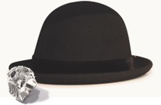 추천 아이템 실버 소재의 야성적인 해골 문양이 남자의 본능을 자극할 만한 링 12만원대·블랙 컬러의 창이 짧고 벨벳 소재가 덧대어진 블랙 페도라 6만2천원 모두 디아프바인 제품.