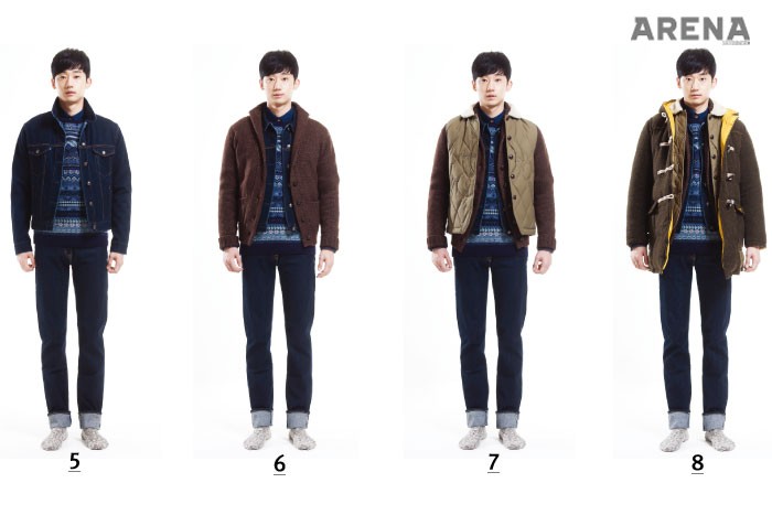 워싱이 들어가지 않은 인디고 컬러 데님 재킷과 팬츠는 한 벌로 입어도 멋스럽고 위에 카디건이나 퀼팅 베스트를 겹쳐 입어도 세련되게 융화된다.