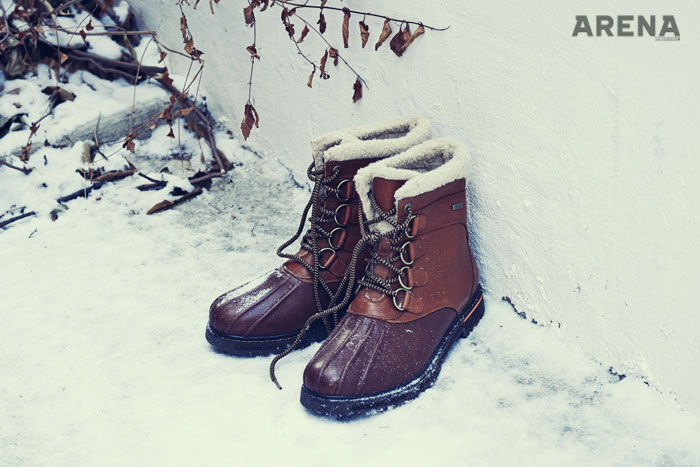 - 연한 갈색 코듀로이 팬츠 19만8천원 타미 힐피거, 헤링본 원단을 사용한 패딩 아우터 2백40만8천원 울리치, 무통 부츠 39만8천원 더클랙슨, 남색 무통 장갑