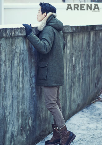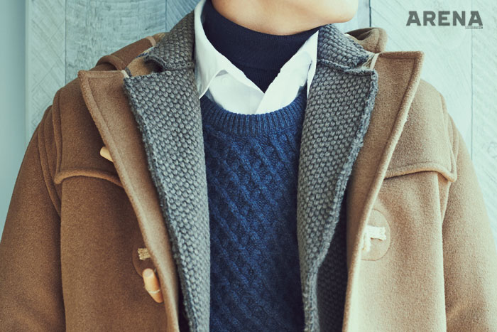 - 검은색 터틀넥 스웨터 19만8천원 보기, 하얀색 옥스퍼드 셔츠 6만9천원 갭맨, 진한 파란색 케이블 니트 56만8천원 빈스, 오돌토돌한 질감이 살아 있는 니트 재킷 34만4천원 메종 by 샌프란시스코 마켓, 베이지색 더플코트 48만원 몽고메리 by