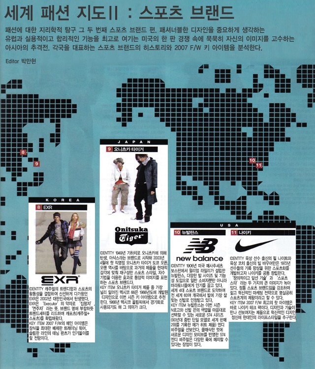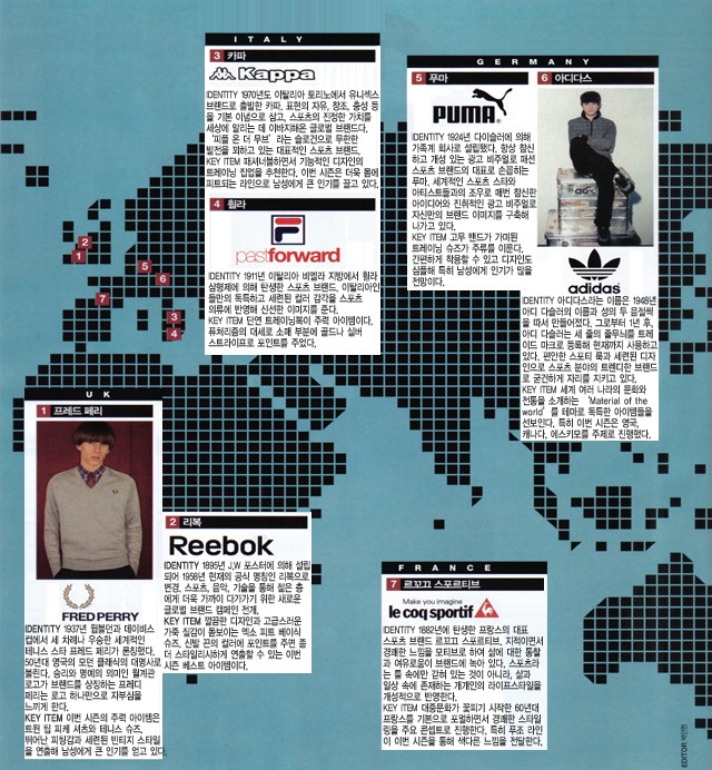 패션에 대한 지리학적 탐구 그 두 번째 스포츠 브랜드 편. 패셔너블한 디자인을 중요하게 생각하는 유럽과 실용적이고 합리적인 기능을 최고로 여기는 미국의 한 판 경쟁 속에 묵묵히 자신의 이미지를 고수하는 아시아의 추격전. 각국을 대표하는 스포츠 브랜드의 히스토리와 2007 F/W 키 아이템을 분석한다. [2007년 10월호]