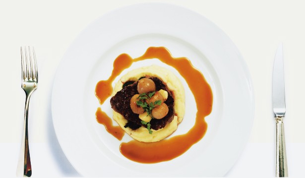 파리스 그릴의 스테이크는 매시트포테이토 위에 고기를 올린 정통 프렌치 스타일. 먼저 미디엄으로 주문한 고기가 알맞게 익었는지 확인하기 위해 나이프로 가운데 부분을 가볍게 눌러보았다. 나이프 테두리를 둘러싼 육즙을 보니 딱 맞게 구워진 듯. 고기를 중심으로 위에는 셔롯(보라색 양파)과 갈릭 콩피(저린 마늘)가 올려져 있고, 아래에는 매시트포테이토와 소테드 시금치가 깔려 있는데 ‘베스트 오브 베스트’의 안심 부위를 사용했다는 셰프의 말은 나이프로 고기를 자르는 순간 확인할 수 있다. 어린아이도 단숨에 잘라 먹을 정도로 부드럽다. 고기에 밴 은은한 숯불 향은 굳이 다른 소스가 필요 없을 정도다. 그냥 먹어도 맛있지만 닭고기 육수와 그릴 향을 살린 레드 와인 소스를 묻혀 먹으면 또 다른 맛을 느낄 수 있다. 바닥에 깔린 매시트포테이토와 함께 먹으면 퍽퍽할 수 있는 고기의 감촉이 아이스크림처럼 부드러워지나 입속에 달착지근한 맛이 맴도는 게 흠. 버터 향을 적당히 품고 있는 시금치의, 푹 익지도 그렇다고 날것 같지도 않은 ‘씹히는’ 질감은 셰프의 노련함이 엿보이는 부분.