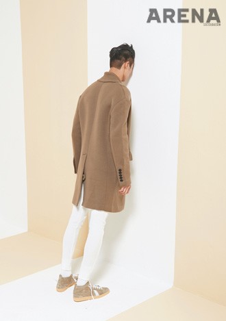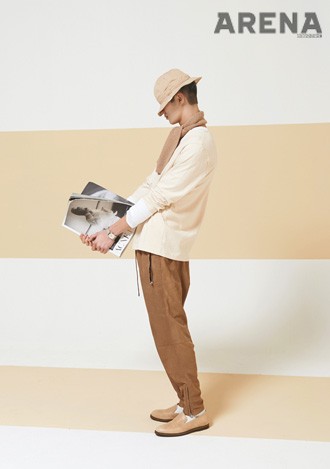 크림색 보트넥 티셔츠 5만7천원 아메리칸 어패럴, 안에 입은 흰색 니트 가격미정 에르메네질도 제냐, 스웨이드 소재 팬츠 가격미정 구찌, 베이지색 버킷 해트 7만2천원 페로우즈 by 배럴즈, 캐멀색 니트 머플러 가격미정 아페쎄, 회색 시계 49만원대 티쏘 by 빈티지 아이, 살색 슬립온 23만8천원 보야지트웰브 제품,