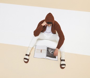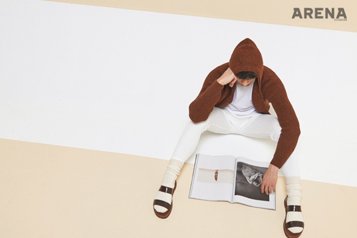 적갈색 니트 카디건 29만8천원 홈코어 by 플랫폼 플레이스, 흰색 티셔츠 6만5천원 아페쎄, 크림색 타이츠 가격미정 데이비드 베컴 보디 웨어 포 H&M, 크림색 양말 1만5천원 밀리터리 서플러스 by 배럴즈, 갈색 가죽 샌들 가격미정 살바토레 페라가모 제품.