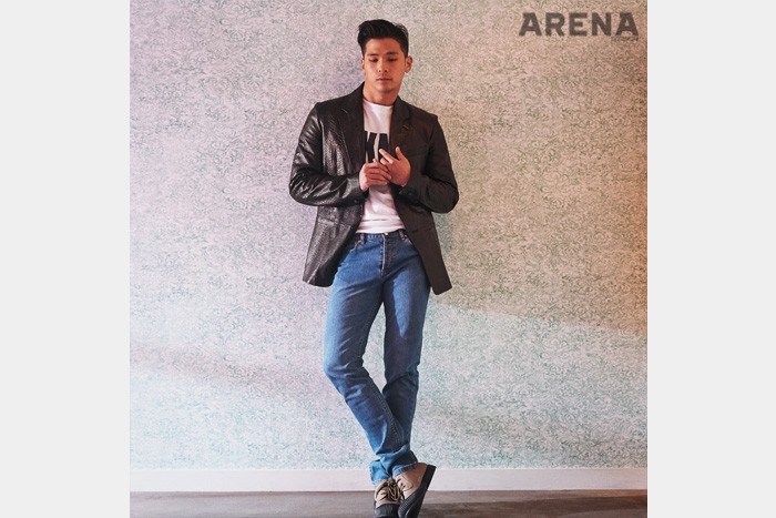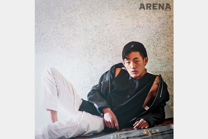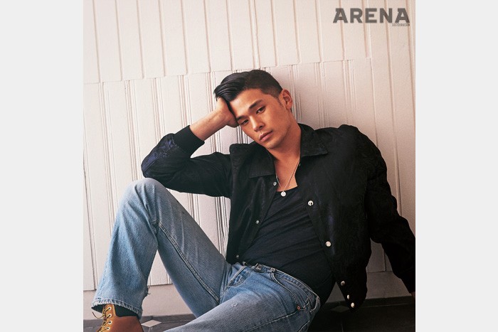뱀피 효과를 준 가죽 테일러드 재킷 가격미정 베르사체, 빅 로고 스웨트 셔츠 가격미정 DKNY X 오프닝 세레모니, 중청 데님 팬츠 29만8천원 아페쎄, 베이지색 스니커즈 가격미정 프라다 제품.