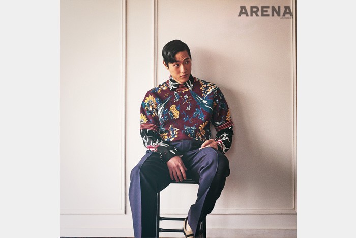 식물 프린트 반소매 니트·하와이언 무드의 셔츠·줄무늬 팬츠·캔버스 벨트·베이지색 스니커즈 모두 가격미정 프라다 제품.