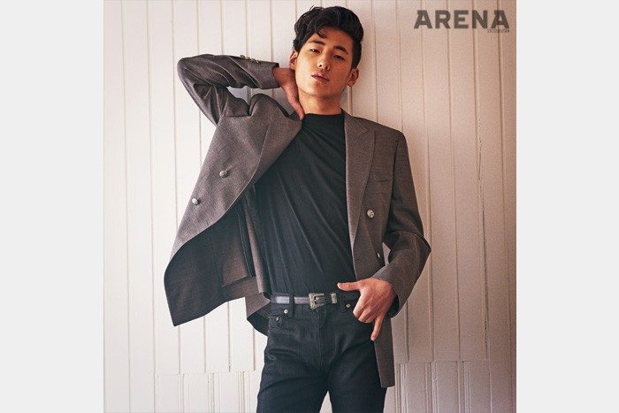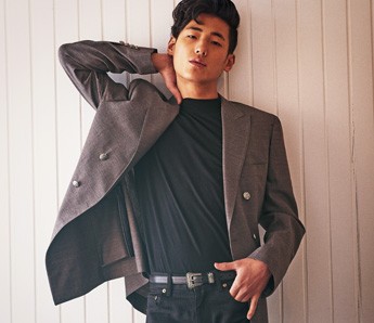 진회색 더블브레스트 재킷 가격미정 브루넬로 쿠치넬리, 모크 터틀넥 반소매 티셔츠 4만8천원 아메리칸 어패럴, 검은색 스키니 팬츠·검은색 벨트 모두 가격미정 생 로랑 제품.