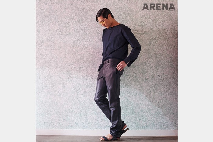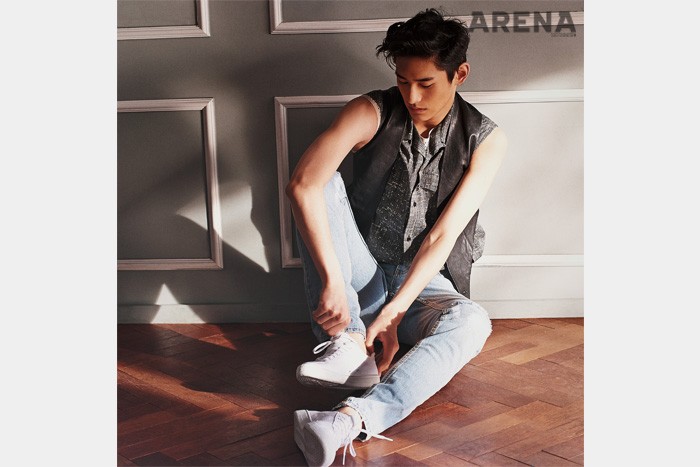 가죽 베스트·망사로 된 톱·민소매 셔츠·오픈칼라 셔츠 모두 가격미정 생 로랑, 연하늘색 데님 팬츠 11만8천원 칩먼데이, 흰색 스니커즈 13만8천원 프레드 페리 제품.