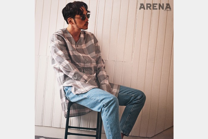 튜닉 형태의 체크 셔츠 49만8천원 김서룡 옴므, 연하늘색 데님 팬츠 11만5천원 아메리칸 어패럴, 빈티지한 선글라스 가격미정 알랭 미끌리 제품.
