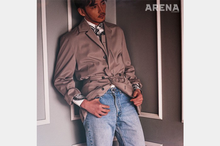 옅은 베이지색 사하라 재킷 가격미정 제냐 꾸뛰르 컬렉션 by 스테파노 필라티, 페이즐리 프린트 셔츠 48만원 에트로, 연하늘색 데님 팬츠 에디터 소장품.