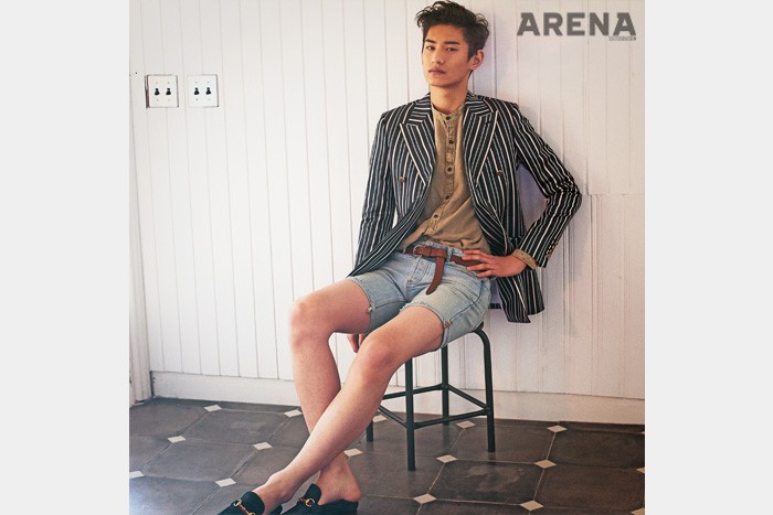 줄무늬 더블브레스트 재킷 1백69만원 김서룡 옴므, 리넨 소재의 카키색 플랫칼라 셔츠 22만원 나파피리, 데님 쇼츠 에디터 소장품, 갈색 가죽 벨트·남색 스웨이드 홀스빗 로퍼 모두 가격미정 구찌 제품.