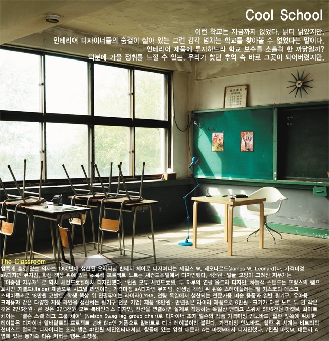 이런 학교는 지금까지 없었다. 낡디 낡았지만, 인테리어 디자이너들의 숨결이 살아 있는 그런 감각 넘치는 학교를 찾아볼 수 없었다는 말이다. 인테리어 제품에 투자하느라 학교 보수를 소홀히 한 까닭일까? 덕분에 가을 정취를 느낄 수 있는, 우리가 찾던 추억 속 바로 그곳이 되어버렸지만.<br><br>[2007년 11월호]