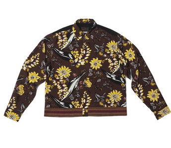 노랗고 화사한 꽃이 큼직하게 그려져 있는 짙은 버건디색의 실크 셔츠 가격미정 프라다 제품.