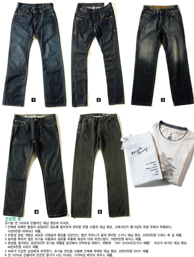 환경 문제에 대한 고민이 제로 상태라 해도 소개해주고 싶은 것이 있으니 바로, 오가닉 데님 팬츠. 데님의 초기 시절을 아는 사람이라면 데님과 오가닉의 만남에 무상함을 느낄 수도 있다. 광부들이 석탄 캘 때 입는 작업복으로 시작한 데님이 지금은 오가닉 소재로 진화에 진화를 거듭했으니까. 특히 이번 시즌 다양한 브랜드에서 친환경 오가닉 소재를 사용한 데님들이 속속 그 모습을 드러내고 있다. 드레스 투 킬에서는 캐머마일 워싱이라는 새로운 기법을 도입, 친환경 공정을 통해 원단을 가공했다. 또 기존에 사용되던 메탈 소재의 캔톤과 리벳 대신 데님 천으로 감싼 단추와 자수를 사용해 차별화된 오가닉 제품을 선보였다. 세계적인 워싱 브랜드와 협업하여 치즈, 커피, 곰팡이 등을 이용한 자연 친화적인 방법을 통해 신개념의 워싱 기법을 연구 중이기도 하다. 리바이스의 오가닉 데님은 농약을 사용하지 않은 유기농 경작법으로 재배한 면화 -전 세계 면화 시장의 0.1%에서만 생산되는- 만을 사용한다는 점이 특징이다. 자연 친화적인 제품임을 알리기 위해 기존의 레드 탭 대신 그린 탭을 사용한 점도 눈에 띈다. 병들고 파괴된 생태계를 되살리고자 하는 리바이스의 경영 철학이 담겨 있기도 하다. 마지막으로 DKNY는 100% 천연 소재인 면과 견을 사용해 민감한 피부를 가진 남성에게 인기를 얻고 있다. 이 같은 최초의 경향은 대부분 데님 팬츠들이 인조 섬유인 나일론을 혼방하는데다 워싱 과정에서 화학 약품을 다량 사용하기도 해 인간과 지구의 건강을 해친다는 우려에서 비롯된 것이다. 바람이 있다면, 최근 패션 업계에 불어 닥친 친환경 바람이 ‘트렌드’에 편승한 경박한 수단이 아니었으면 하는 것이다.