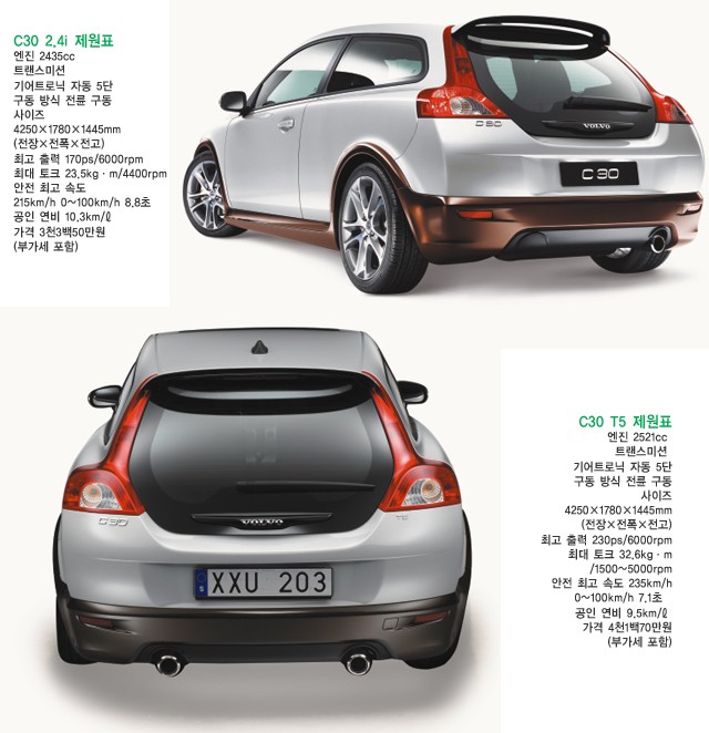 같은 차종이지만, 튜닝한 것처럼 더 커진 엔진을 탑재한 차엔 항상 관심이 간다. 성능은 남자들을 자극하는 최고의 덕목 아니겠나. C30 2.4i와 C30 T5는 제원표에서 보듯 변속기는 동일하고 차체 크기 역시 같다. 단지 배기량에 차이가 있을 뿐이다. 이 차이는 출력에서 60마력을, 토크에 있어선 9.1kg·m의 차이를 만들어냈다. 하지만 이게 전부는 아니다. T5 버전은 스포츠 서스펜션을 적용해 차고를 20mm 내려주는 재주를 선보인다. 그리고 기본 2.4i엔 머플러가 하나였지만, 스포츠성이 더 강조된 T5는 머플러가 좌우 양쪽으로 두 개다. 하지만 솔직히 말해 안팎의 생김엔 큰 차이가 없다. 머플러의 개수 차이를 논하고 있는 것만 봐도 알 수 있지 않겠나?