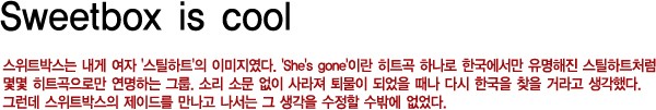 스위트박스는 내게 여자 `스틸하트`의 이미지였다. `She`s gone`이란 히트곡 하나로 한국에서만 유명해진 스틸하트처럼 몇몇 히트곡으로만 연명하는 그룹. 소리 소문 없이 사라져 퇴물이 되었을 때나 다시 한국을 찾을 거라고 생각했다. 그런데 스위트박스의 제이드를 만나고 나서는 그 생각을 수정할 수밖에 없었다.<br><br>[2006년 7월]