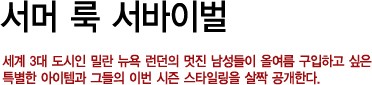 세계 3대 도시인 밀란·뉴욕·런던의 멋진 남성들이 올여름 구입하고 싶은 특별한 아이템과 그들의 이번 시즌 스타일링을 살짝 공개한다.<br><br>[2006년 7월호]