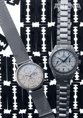 이름 듣고 이미 짐작했을 거다. 맞다. 1957년에 제작된 초창기 오메가 스피드마스터와 무척 흡사하니까. 이 시계는 스피드마스터의 탄생을 기리기 위해 출시된 제품이다. 양쪽이 대칭되는 케이스와 브레이슬릿에서 직선 형태로 연결되는 러그의 모습은 초기 문워치의 모습과 닮았다. 코-액시얼 칼리버 9300을