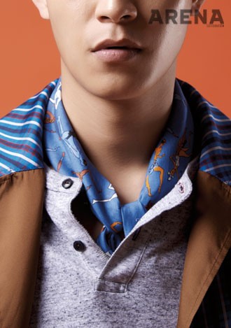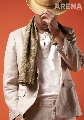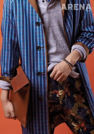 멜란지 소재의 헨리넥 티셔츠 15만8천원 레이닝 챔프 by 플랫폼 플레이스, 재치 있는 일러스트의 면 스카프 12만9천원 드레이크스 by 유니페어, 화려한 파란색 줄무늬의 실크 코트 가격미정 루이 비통