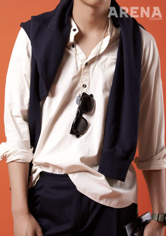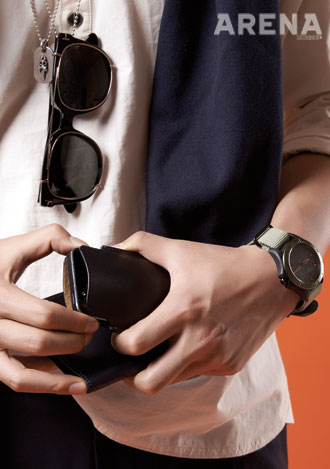 탈착 가능한 클립온 형태의 검은색 선글라스 65만원 톰포드 아이웨어, 카키색 벨크로 스트랩 시계 10만5천원 타이맥스 워치 by 갤러리어클락, 얇고 납작한 검은색 가죽 지갑 35만8천원 아페쎄, 검은색 가죽 아이폰5 파우치 6만5천원 인케이스 제품.
